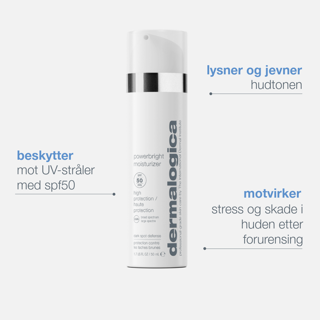 PowerBright Moisturizer SPF50 beskytter huden mot den største årsaken til både aldringstegn generelt og pigmentering: nemlig solen! Dagkremen reduserer i tillegg eksisterende pigmentering og gir fuktighet og pleie til huden.
